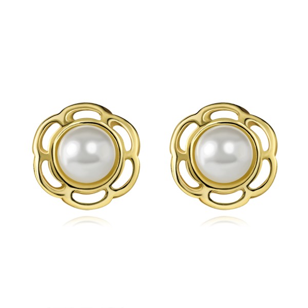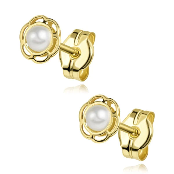 14K gold earrings take the form of tiny flower, the centre of which consists of a white cultured pearl. The pearl is bordered by a regular contour with rounded cut outs that resemble the shape of flower petals. The resulting design feels harmonious and delicate, with a romantic character. The earrings have a push back closure.