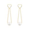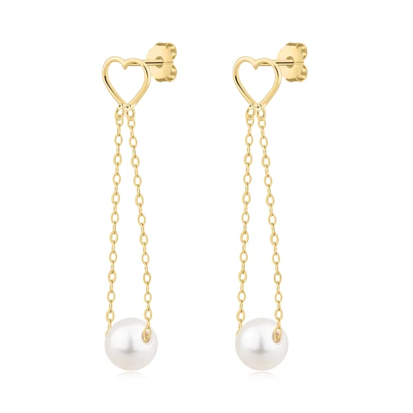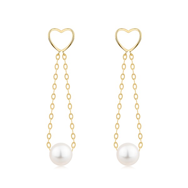 14K yellow gold earrings combine the symbolism of a heart with the softness of a white pearl. A chain with vertically aligned links is attached to the heart’s outline on both sides, and in the lower part a round white cultured pearl is threaded through it. The earrings are secured with a push back closure and appear harmonious and feminine.