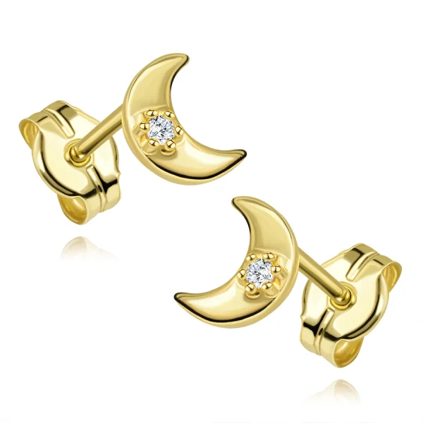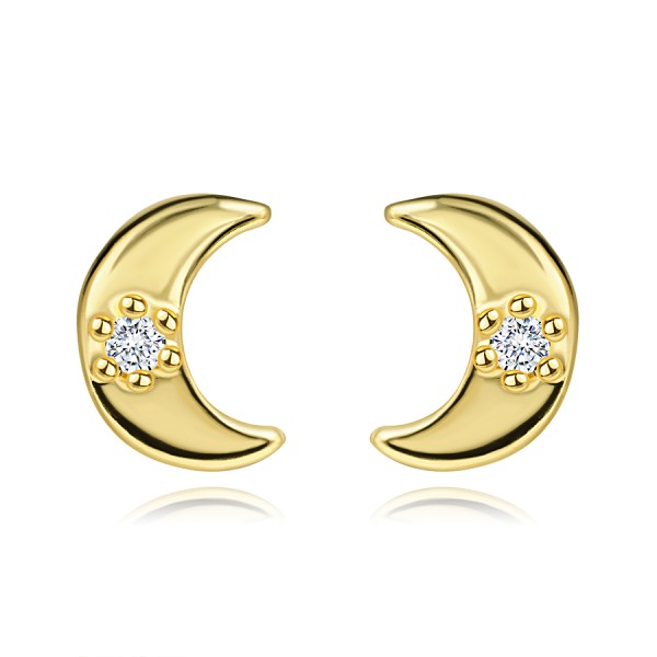 14K gold earrings feature a smooth crescent with a slightly curved shape. A clear zircon is set in the centre, secured by six gold prongs. The compact design stands out with clean lines and a mirror-glossy surface. The earrings are completed with a practical push back closure for comfortable wear.