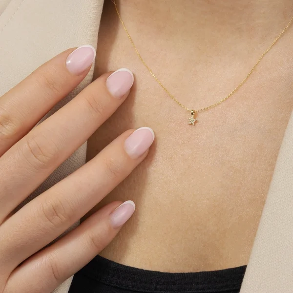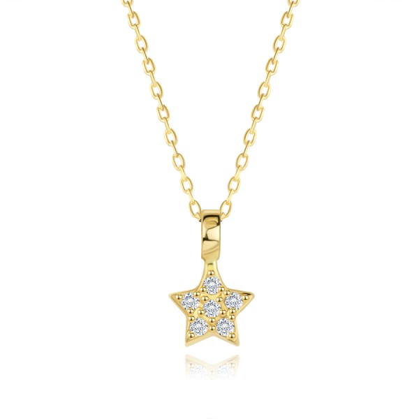 Gold necklace made of 14K yellow gold consists of a fine chain with oval links and a small pendant in the shape of a symmetrical star. Each of the star’s five shoulders is decorated with a clear zircon, while one is also set in the centre. The necklace includes an extension chain for minor length adjustment.