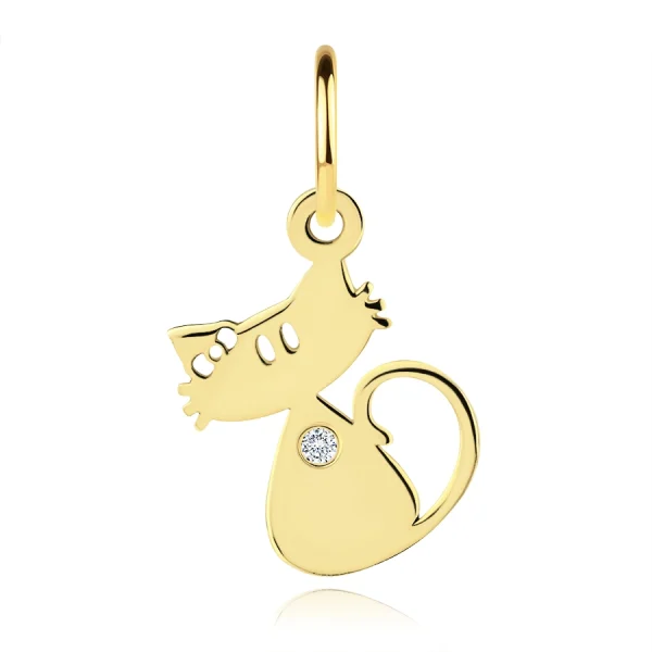 14K gold pendant has a playful cat design with a bow-shaped cutouts, oval eyes, and a curled tail. A round clear zircon is placed on the cat’s body, giving the piece a charming sparkle and original touch. The oval clasp for a chain blends smoothly with the pendant’s silhouette, complementing its clean and elegant look.