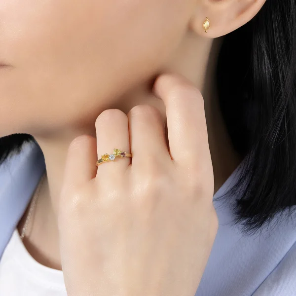 Ring in 14K gold with an original design has four colourful gemstones – yellow citrine, blue Swiss topaz, green peridot, and purple amethyst. The stones are set at alternating heights, creating a gently dynamic effect. This original design together with glossy surface and precise craftsmanship appears playful and elegant.