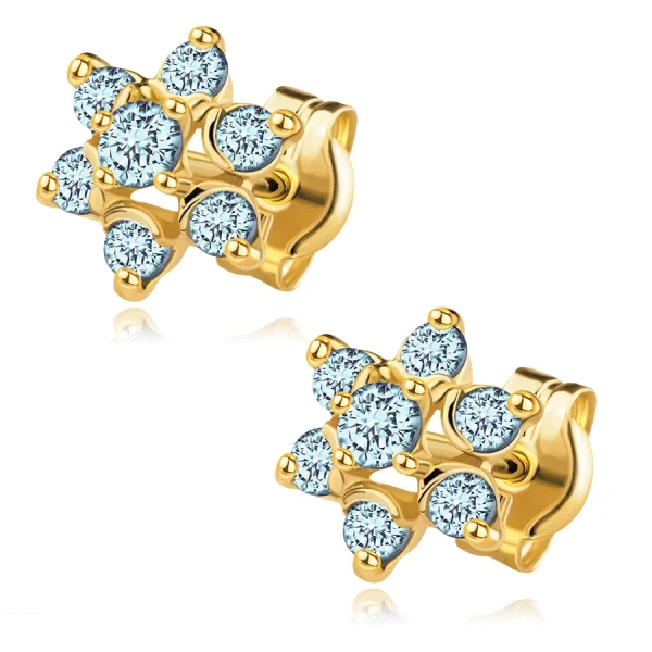 Earrings made of 585 yellow gold decorated with a flower motif. Petals are slightly curved downwards and made up of smaller synthetic aquamarines. The centre of the flower consists of a protruding synthetic aquamarine, set in a raised basket with four prongs. The stones are made in light blue tone and are round in shape. The earrings have a push back fastening using a pin and brake.
