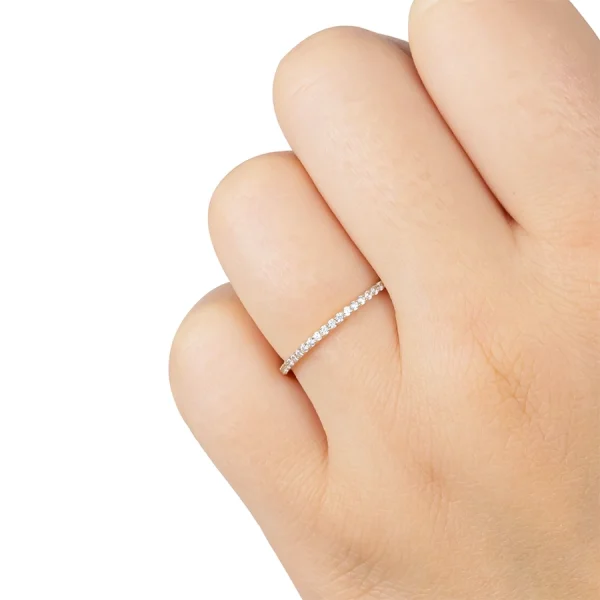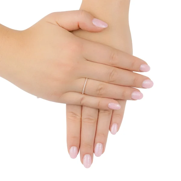 Ring made in 585 yellow gold has the shape of a slim band with an angular shoulder. The decorative part features a row of round clear zircons, set in the front half of the ring. The surface of the ring is smooth and glossy.