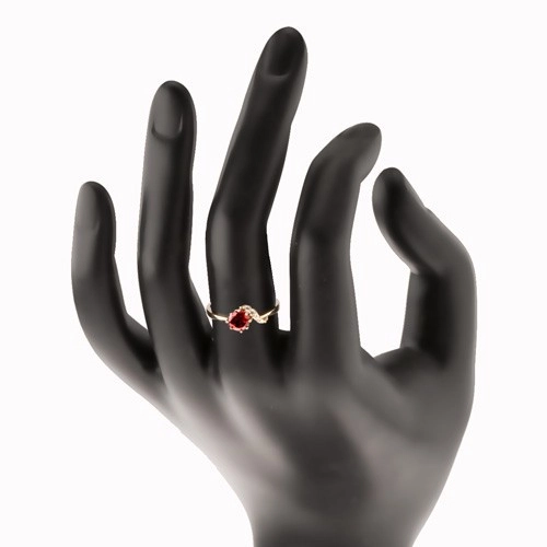 A beautiful ring made of 9-carat gold, decorated with a diagonal line paved with clear zircons and a larger round deep red garnet. This is a truly gorgeous jewellery piece that should become part of every woman’s jewellery box. This gorgeous ring is made from high quality 375 yellow gold, ensuring its durability and long life. The shoulders of the ring are smooth and shiny, narrowing slightly at the front, which adds to its style and elegance.