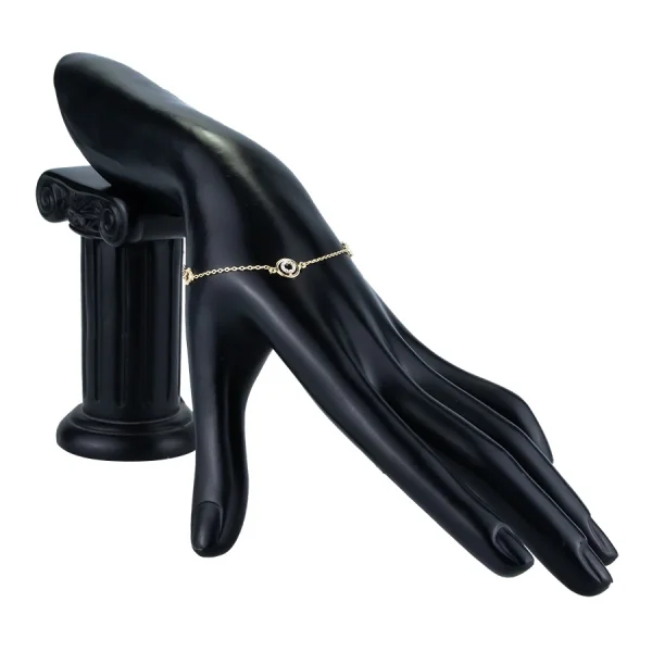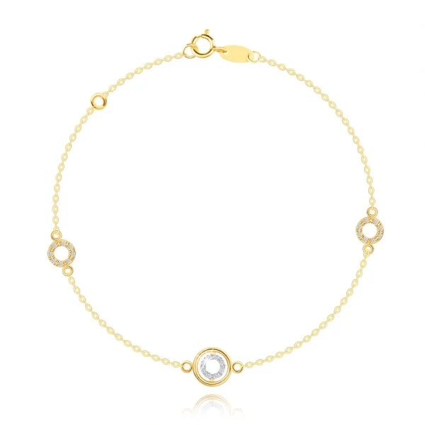 The smaller circles have tiny clear zircons set along the perimeter, placed between the smooth gold prongs. These zircons attract light and shine on your wrist, creating flashes and a subtle play of light. The centre ring is doubled to create a layering effect, adding depth and dimension to the bracelet. The inner ring is adorned with additional clear zircons that hold the white gold prongs. This contrast between the white and yellow gold creates a striking visual effect and adds sophistication to the bracelet. The outer ring is smooth and mirror glossy, adding a stylish and elegant touch to the bracelet.