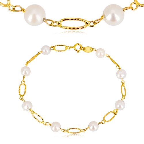 Gold 14K bracelet – rings of oval shape with small crossed notches on both ends, cultured pearls of white colour.