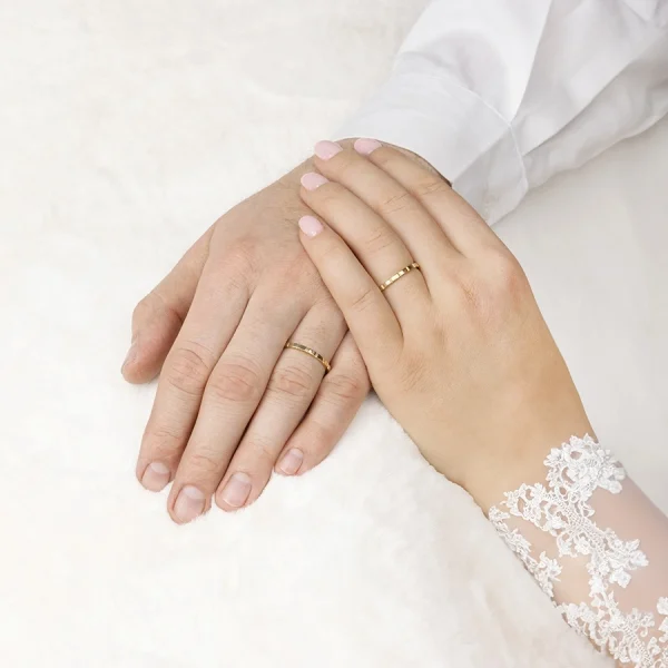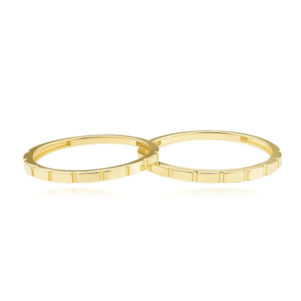 Wedding band in 14K yellow gold has narrow shoulders with an angular cross-section, decorated in the front with vertical notches. These visually divide the decorative part into smooth rectangles. The surface of the ring is glossy.