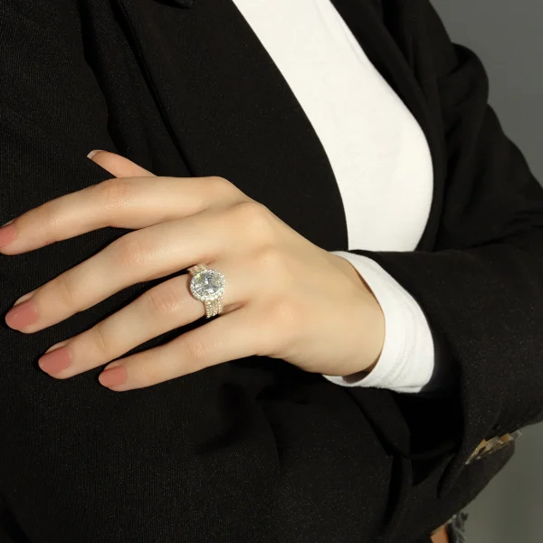Read More Details925 silver engagement ring has wide shoulders which are at the front part richly decorated with three lines of tiny clear zircons. In the middle of the ring is imbedded a large oval zircon in clear colour with shiny cut surface and a sparkly rim.