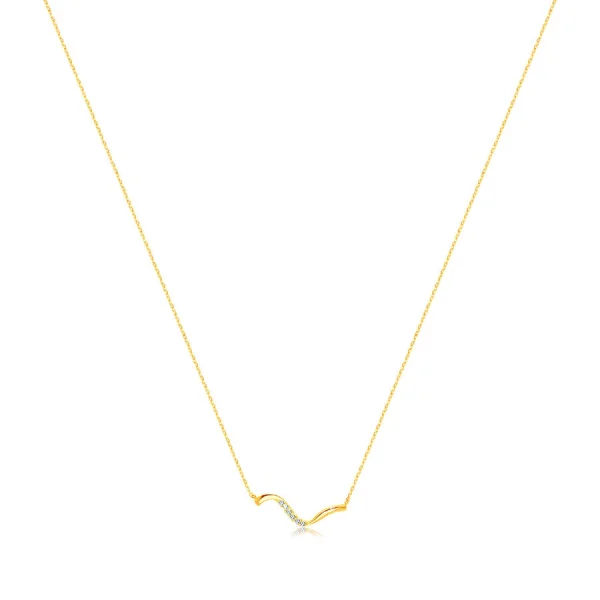 Read More Details375 Golden necklace decorated with a shiny asymmetrical wavy line paved with round clear zircons. The chain is composed of tiny oval links connected together. The necklace length is adjustable and has a spring ring closure.