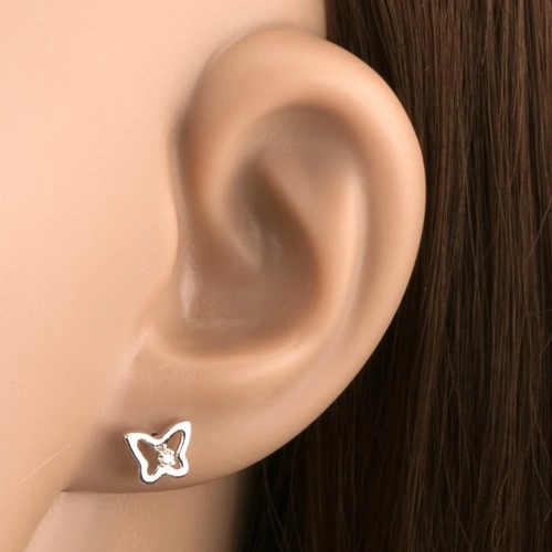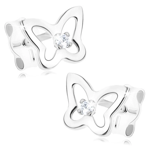 9K white gold earrings feature a butterfly outline, crafted from smooth, polished lines. A faceted clear zircon is set at the centre, adding a soft sparkle to the design. The earrings have a push back closure.