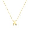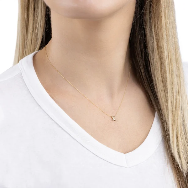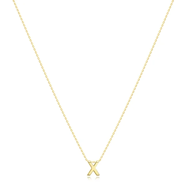 Necklace made in 375 yellow gold consists of a chain with vertically connected flattened oval-shaped links. The pendant features a capital block letter “X” with a smooth and shiny surface. The letter is doubled, the front side is connected to the back side by thin bars in the upper and lower part of the letter. The bars are also used for threading the chai
