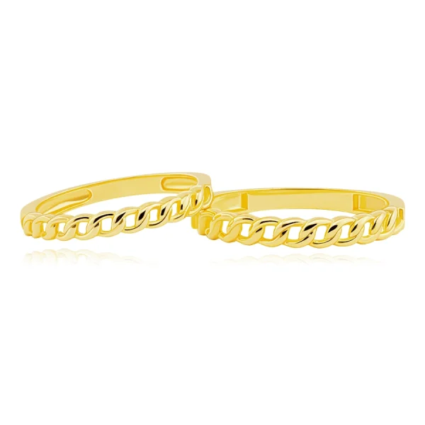 Wedding bands made of 14K yellow gold have shiny and smooth shoulders that split in the front into two intertwining wavy lines. They create the impression of interlaced chain links with cut-outs in the centre. The links are joined tightly in a row and are oval in shape.