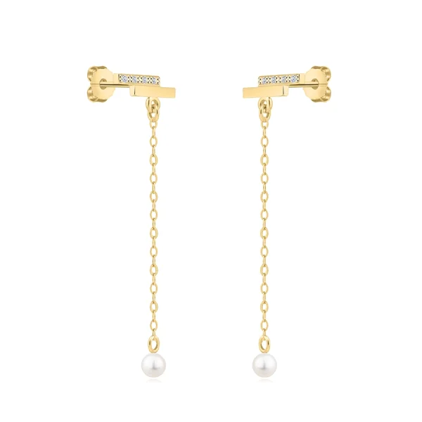 14K gold earrings combine a modern shape with timeless detail. The upper is adorned with two lines – one smooth, the other adorned with clear zircons. Attached to them is a chain that ends in a round white cultured pearl. Earrings have a push back closure and bring a balanced contrast between clean shine and the soft tone of the pearl.