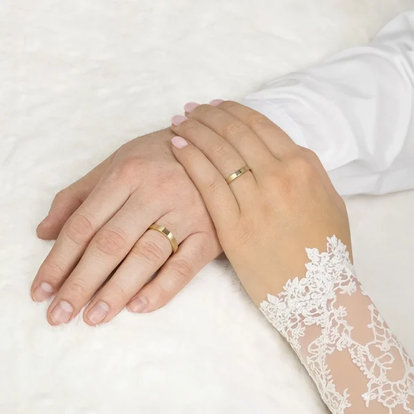 585 Yellow gold wedding bands are decorated with a smooth glossy rectangle placed in the centre of the wider part of the shoulders. The shoulders have a matte satin surface at the front and gradually transition into narrower, mirror glossy shoulders with a smooth surface.