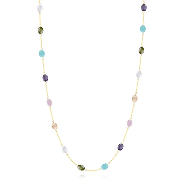 9K Gold necklace adorned with oval zircons in six colours, flat oval links, a spring ring.