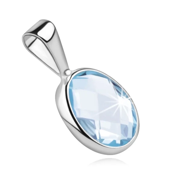 585 Gold pendant consists of a light-blue cut oval-shaped topaz. Topaz is outlined with a smooth and glossy hem in white gold. The pendant has a non-moving clasp for a chain, that widens upwards.