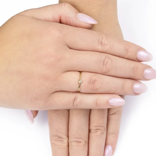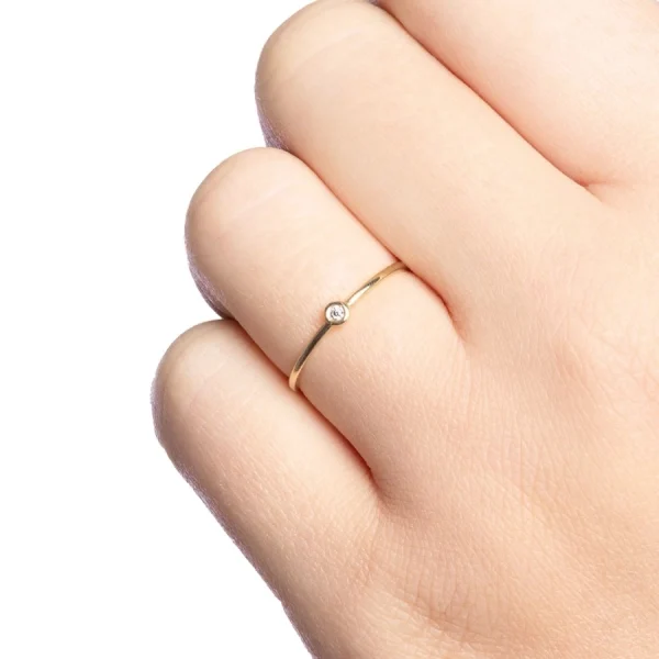 Ring made of 14K yellow gold brings a delicate design dominated by a round clear zircon. It is set in a smooth basket, giving it a stable setting and making its clear appearance stand out. The smooth shoulders of the ring accentuate the contrast between metal and stone, creating a balanced impression. The overall composition highlights a simple aesthetic that blends modern minimalism with traditional materials. The finishing highlights the natural shimmer of the gold, while the stone acts as a focal point. Every detail suggests an emphasis on precision, while the resulting look remains pleasingly harmonious. This piece of jewellery may appeal to those who enjoy clean lines and attention to detail.