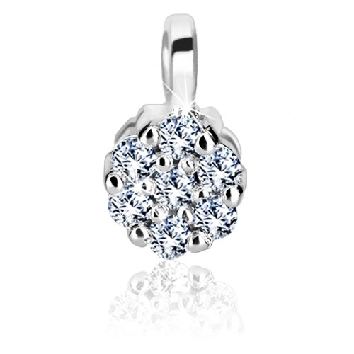 Read More DetailsThe pendant is available in white 585 gold with round shape. It is adorned with seven round zircons with flower motif at the front of the circle. The glittery zircons are clear. The pendant clasp is round and it is placed at the top of the pendant.