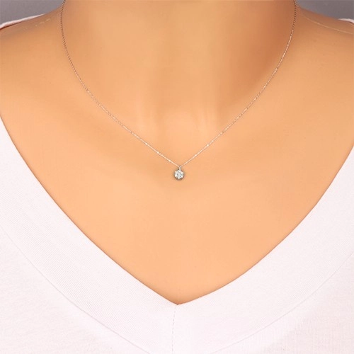 Read More DetailsThe pendant is available in white 585 gold with round shape. It is adorned with seven round zircons with flower motif at the front of the circle. The glittery zircons are clear. The pendant clasp is round and it is placed at the top of the pendant.