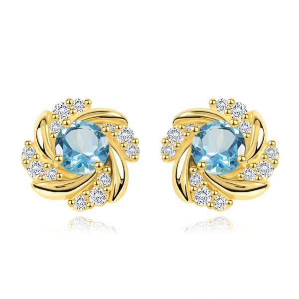 Adorned with a central blue topaz, these 9K yellow gold earrings exude elegance. The design features alternately smooth and zircon-studded petals, creating a floral motif that is both classic and contemporary. Secured with a post fitting, these earrings offer a touch of sophistication for any occasion.